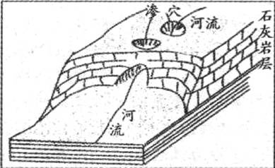 本题解析:1.由图中的石灰岩层、渗穴、河流信息知道该地貌属于喀斯特地貌,发育需要的气候条件应是温暖湿润。