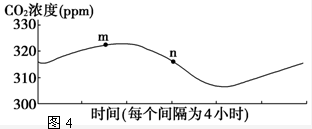 5、单选题 绿色植物新陈代谢的总趋势是,白天通过光合作用消耗CO2制造O2,夜间则消耗一定数量的O2,由此导致静风林区CO2浓度的日变化。图中(图4)示意(60°N,80°E)附近某静风林区CO2浓度日变化。完成8—9题。