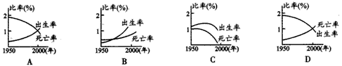 3、单选题 读某省人口出生率、死亡率变化图(图1)和人口年龄结构变化图(图2),回答1—2题。