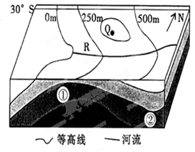 3、单选题 下图为30°S附近沿海某地等高线地形图和地层示意图,R河流正值汛期。读图回答下列各题。