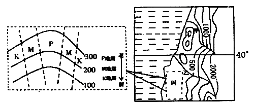 4、单选题 下图为某大洋东岸大陆等高线地形图;左图为丙区域的放大图,其中实线为等高线(单位:米),虚线为地层界线。回答题。