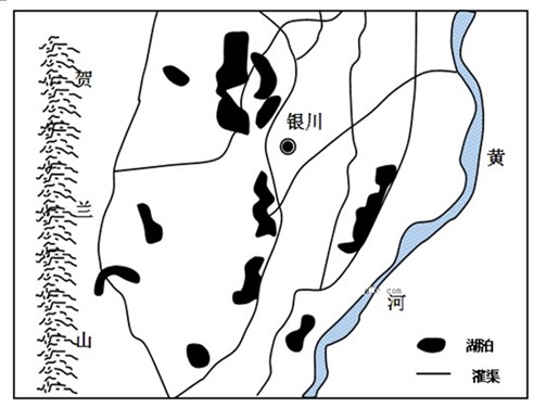 3、单选题 地处干旱区的宁夏银川市,其周边地区曾广布湖泊,明清时有“七十二连湖”的说法。20世纪80年代银川周边湖泊所剩无几。1999年开始,银川实施恢复湿地的计划。图示意银川周围目前的湖泊分布。据此完成题。