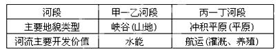 (1)对比左图中甲-乙河段、丙-丁河段主要地貌类型和河流主要开发价值的差异,完成下表内容。(4分)