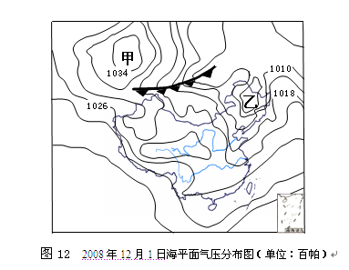 (1)从图12中判断,甲、乙两地中受高压系统控制的是 地,其天气状况是 。