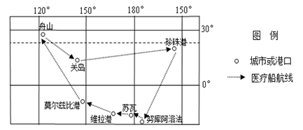2014年6月9日,中国海军首次派出包括驱逐舰、护卫舰及医疗船等在内的海军舰队参加环太平洋军事演习,舰队途经关岛于夏威夷当地时间(区时)6月24日9时抵达珍珠港,又经数月航行后,其中的医疗船于9月29日驶回舟山。下图为医疗船航行路线示意图。