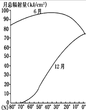 2、综合题 下图是北半球海平面6月和12月太阳月总辐射量随纬度变化示意图,读图回答下列问题。