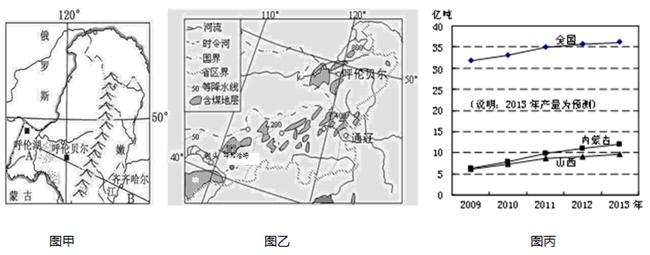 材料三:图丙是2009~2013年内蒙古、山西和全国煤炭产量统计图