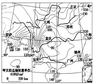 4、综合题 阅读我国部分地区年太阳辐射量分布图,回答问题。(20分)