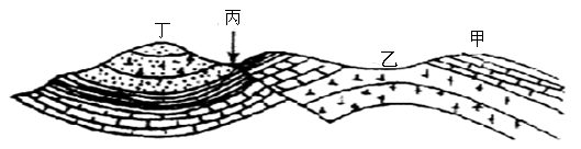 (1)读图根据岩层走向可判断背斜为乙,向斜是丁,断层是丙。