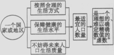 人口合理容量是指按照合理的生活方式,保障健康的生活水平,同时又不妨碍未来人口生活质盈的前提下,一个国家或地区最适宜的人口数量。图示如下: