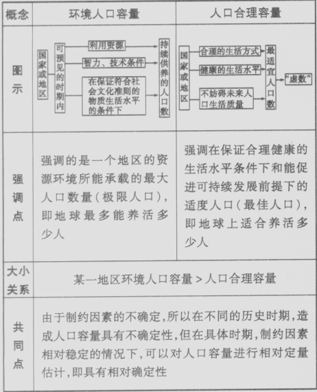 环境人口容量与人口合理容量是两个既有联系又有区别的概念,两者之间的区别与联系表解如下: