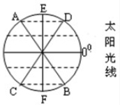(1)光照图发热判读:根据此图可以看出,北极圈以北地区为极昼,南极圈以南为极夜,(2)可以判定改图为夏至日的光照图。次日北半球昼大于夜并且纬度越高昼越长,南半球相反。C点的白昼最短。B点地地理位置最靠东,看到日出最晚。