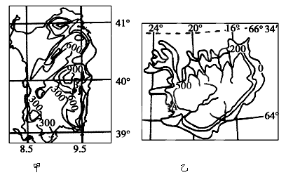 3、综合题 (12分)甲、乙两图分别表示两个不同地区的等高线地形图(单位:m)。读图,回答下列问题。