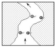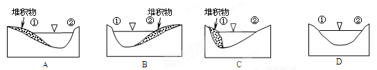 本题考查河流的侵蚀作用。根据图示河流弯曲处凹岸受侵蚀严重,河床坡度较陡,①为凸岸,河流沉积,河床较缓。所以本题选择A选项。