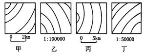 本题考查地图的基础知识,等高线的判读和比例尺的计算。四图等高距相等,则表示垂直相对高度相差相等。则水平距离越近,坡度越陡。图中水平距离的计算根据比例尺的大小,比例尺越大,反映的地理范围越小,则水平距离越近。四幅图的比例尺大小换算比较如下:甲1:200000,乙1:10000,丙1:500000,丁1:50000,所以大小排序为丁>乙>甲>丙。所以水平距离最小的是丁,所以坡度最大的是丁。所以本题选择D选项。