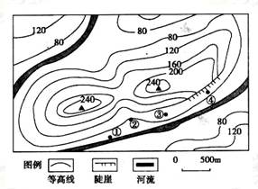 【小题1】浙江夏季是雨季,①位于河流沿岸,一旦遇到暴雨天气,水位上涨,容易出现险情。②地位于山谷口,在山区容易发生山洪灾害,有遭遇泥石流的危险。④处是陡崖,容易发生碎石崩落危险。③处地势较高,地形较开阔平坦,没有前面的各种灾害,地质灾害最少,故A正确。从图中可见河道比较平直,B错误;从图中可知等高距为40米,陡崖顶部的范围为200-240米,底部的海拔范围为80-120米,所以陡崖的相对高度范围为80-160米故C错误;等高线较稀疏故D错误。