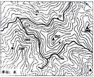 小题1:山区公路应分布于河谷地带和鞍部,故根据图示等高线的凸向“凸高为低”,故判断丙处为鞍部,两侧为山谷,故丙处地势最高。