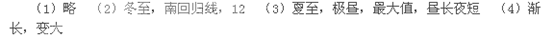 (3)由上图可知A处太阳直射在北回归线,是北半球夏至,北极圈及以北地区出现极昼现象,北回归线及以北地区正午太阳高度达一年中最大值,北半球昼长夜短。