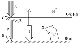 (其中A是太阳辐射,B大气吸收的太阳辐射,C是大气反射的太阳辐射,D到达地面的太阳辐射,E地面反射,F地面辐射)