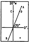 (1)根据此时地球公转速度较快,太阳直射点位于南半球,图中夹角为70°,所以太阳直射点的纬度为20°S。太阳直射点位于南半球,所以AB为晨线,C点所在经线为20°W,则直射点的经度为70°E。