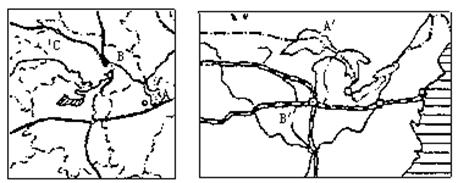 小题1:本题考查城市地域形态。根据图示:甲地城市功能区主要分布在河流沿岸,地势较为平坦地区;乙地城市功能区主要分布在河谷地区,所以图中两城市地域形态形成的主要原因是地形。所以本题选择A选项。