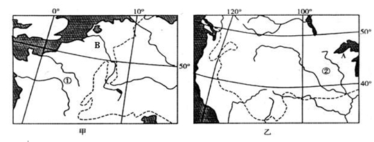 (2)两图所示的50°N地区,甲与乙比较甲图该地区冬季气候有什么特点?试分析其原因。(6分)