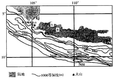 2、综合题 下图是某群岛附近海域等深线图。喀拉喀托火山于1853年8月26日从水深305米的海底猛烈喷发,引发的海啸导致澳大利亚36000多人丧生。这次火山喷发后,火山露出海面,其后又多次喷发。现今该火山海拔813米。