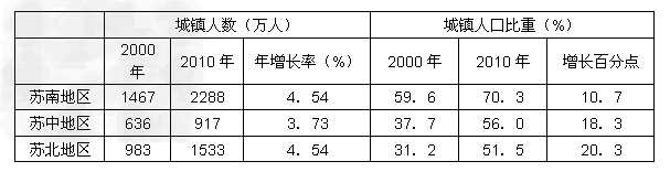 4、单选题 下表为“2000 年和2010 年江苏省不同地区城镇人口及比重”。据此完成1-2 题。