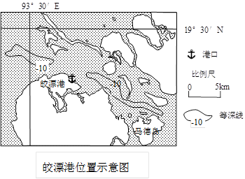 参考答案:(1)密支那地处印度洋板块与亚欧板块的交界处,岩层破碎,地壳活跃,地下岩浆活动频繁(2分)。第一种观点为岩浆沿岩层缝隙侵入后,冷却凝固形成岩浆岩(翡翠) (2分);第二种观点为侵入的岩浆使与之相邻的岩石变质形成变质岩(翡翠) (2分)。(2)10km2(2分)来自中东和非洲地区的原油经油轮运输到这里,改为管道运输进行转运(2分)。马德岛外围有半岛与岛屿包围,受风浪的影响小(2分),有深水航道,油轮进出安全方便(2分)。马德岛成为石油的转运点,岛上要修建码头、港口及与之配套的设施(2分)。工程建设给当地流入资金,带来较多的就业机会,带动建筑、交通、酒店等行业发展,提高经济收入,加快发展速度(2分)。