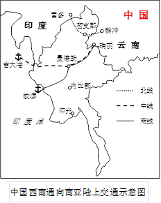 材料二?中国西南通向南亚陆上交通示意图与皎漂港位置图