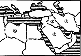 本题解析:(1)①是伊朗、②是伊拉克、③是沙特阿拉伯、④是利比亚。图示区域,地形以高原为主,伊拉克没有丰富的磷矿,阿拉伯国家大多数信奉伊斯兰教,不属于的是伊朗。图示区域有世界最大的沙漠—撒哈拉沙漠。(2)图中数码代表的著名产油国中,石油产量和储量最多的是③是沙特阿拉伯。