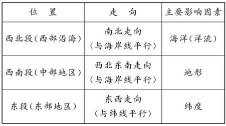 (1)?分析乙图中一月0℃等温线的大致走向,完成下表。