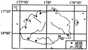 (4)根据该岛屿的纬度位置可以判断该地位于东南信风的控制区。M地位于岛屿东岸,处于来自海洋的东南信风的迎风坡,多地形雨;N城处于背风坡,降水少。