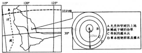 (2)甲图中的洋流从较高纬度流向较低纬度,为寒流,该洋流为西澳大利亚寒流;L地植被由中心向四周逐渐减少,形成了荒漠化圈,该环境问题的主要人为原因是过度放牧。