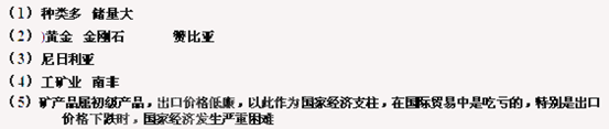 本题解析:本题考查世界矿产资源。(1)图示非洲南部地区矿产资源丰富,储量大,种类多。(2)非洲南部盛产金矿和金刚石;赞比亚为世界最主要的铜矿生产国。(3)非洲几内亚湾的石油出口国尼日利亚;(4)非洲经济做发达的国家是南非,其矿产资源丰富,且工矿业发达。(5)初级产品的出口,价格较低,在国际贸易中居于不利地位。