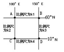 3、单选题 在下图所示的经纬网示意图中,用k1、k2、k3、k4分别表示AB、AC、BD、CD段的比例尺,那么各线段比例尺大小排序正确的是:( )