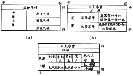 1、单选题 读气候、植被和土壤分布模式表,回答1~4题。