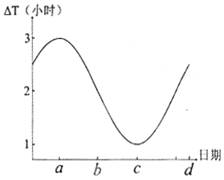 小题1:甲、乙两地昼长相同太阳应直射赤道,读图可知,甲乙两地的日出的时间差最大为3小时,此时太阳应直射回归线,甲地昼达最长,日出最早,时间差达最大;最小为1小时,此时太阳应直射另一回归线,甲地昼最短,日出最晚,时间差达最小,那么直射赤道时,两地的日出时间差居中为2小时,对比图中四个日期,日出时间差为2小时是b。故选B。