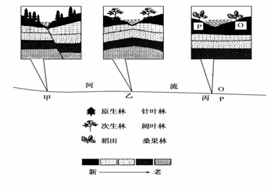 (2)地转偏向力北半球右偏,南半球左偏,赤道上不偏转,丙处位于河流下游,剖面图中河流的右岸(P地)较陡,以侵蚀为主,左岸(O地)较缓,以沉积为主,判断地转偏向力向右偏,所以是北半球。