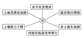 小题1:本题考查自然地理环境的整体性。组成地理环境的各要素(地貌、气候、水文、植被、土壤等)是一个整体,各要素相互联系,相互制约构成一个整体。图中所示的中心事象“甲”最有可能是森林破坏。所以本题选择C选项。