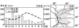 2、单选题 下图为“某河流局部水系及甲地月平均径流量曲线和降水量柱状图”。甲地径流峰值显著滞后于降水峰值的主要原因是( )
