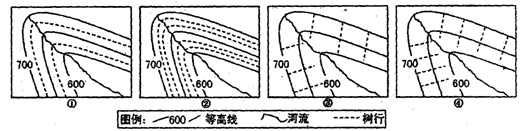 小题2:山坡植树的一般规律:树行与水流方向垂直,即与等高线平行。故选B项。