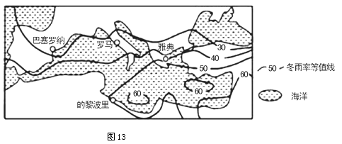 2、综合题 (10分) 图13为地中海地区冬雨率等值线图(冬雨率为冬季降水量占全年降水量的百分率,单位:%)。读图回答下列问题。(10分)