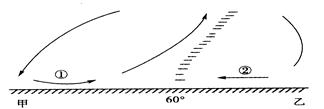 【小题1】据图中极锋倾斜方向可知,乙地位于北极点,故①是副热带吹来的暖湿气流;甲地为下沉气流,为副热带高气压带,故甲点位于300N附近,乙地为极地高气压带,①是盛行西南风,②是极地东风,为东北风。