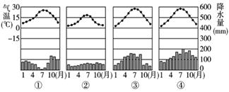 (3)下图中的四幅气候资料图中,与乙地的气候特征相符的是?。这表明乙地的气候特征与甲、丙相比有细微的差别,体现在?。(2分)
