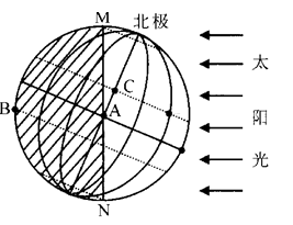 (3)根据地球自转方向(自西向东),弧MAN是由黑夜进入白天,所以为晨线。B为黑夜的中央,所以为0点。A为晨线和赤道的交点,所以为6点,再根据同一条经线上地方时相等得到B为6点。