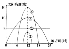 1、单选题 右图中①②③④四条线分别表示北半球夏半年某日四地的太阳高度变化过程(h为一已知量),读图后回答下列各题。