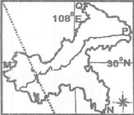 3、单选题 阅读重庆直辖市区域图(下图),图中虚线表示晨昏线,且与赤道夹角为66°34′,M、N、P、Q表示该行政区域的四至点,此时,伦敦为正午12点,回答下题。