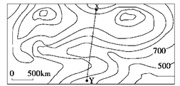 本题解析:本题考查地形剖面图。结合X、Y两地的海拔高度,X海拔1100M;Y海拔700—900M;和中间的三个局部地形区。从X到Y的剖面首先经过一处鞍部,中间最高处海拔为1300---1500M;之后经过一河谷,底部海拔为700—900M;靠近Y处为一山脊,最高处海拔为1100—1300M。据此判断D图符合。