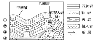 2.读图可知,乙处地貌为山谷,是背斜顶部受侵蚀形成的。丙处是向斜成山,丁处是断层容易发生侵蚀而形成山谷。